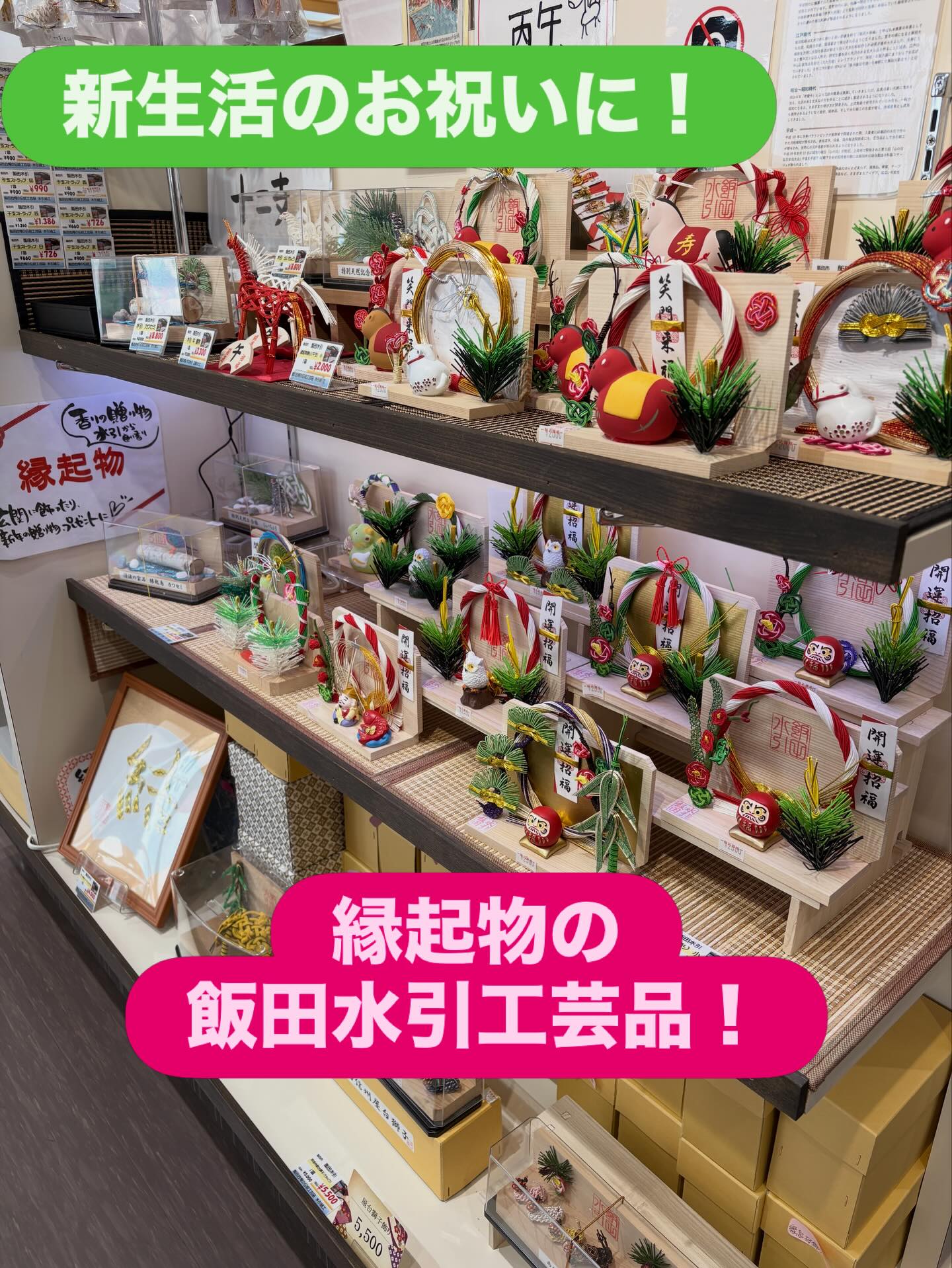 水引などの伝統工芸品、布製品や革製品、地場産品と呼ばれるものを販売させていただいております。飯田市や下伊那郡の食品、お土産を中心に、 おいしいもの、珍しいものをたくさん揃えています。